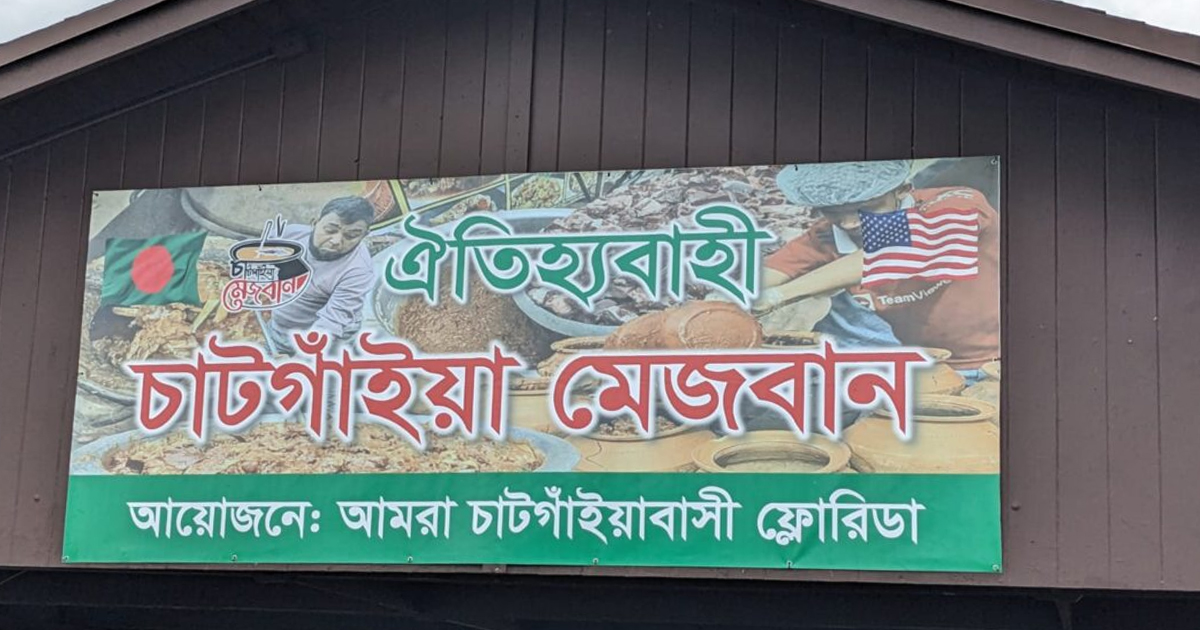 কান পাততেই শোনা গেল, ‘বদ্দা, গম আছন নে? (ভাই, ভালো আছেন?)’ কিংবা ‘মেজ্জাইন্যা গোস্ত ফোয়াদ অইয়ে (মেজবানের মাংস মজা হয়েছে)’। এ আর এমনকি! চট্টগ্রামের ঐতিহ্যবাহী মেজবানী অনুষ্ঠানে এমন কথা তো কানে আসবেই। তবে ভালো লাগাটা আরও বেশি আত্মা ছোঁবে যখন জানবেন চট্টগ্রামের আবহে কয়েক হাজার বাংলাদেশীর এই মিলনমেলা জমে উঠেছিল ১৩ হাজার মাইল দূরের সুদূর আমেরিকার ফ্লোরিডায়।