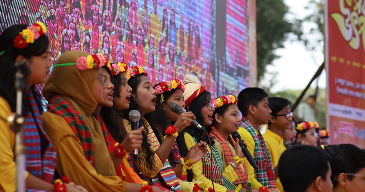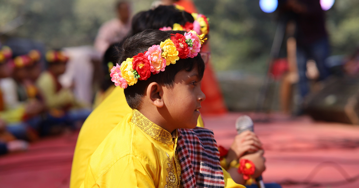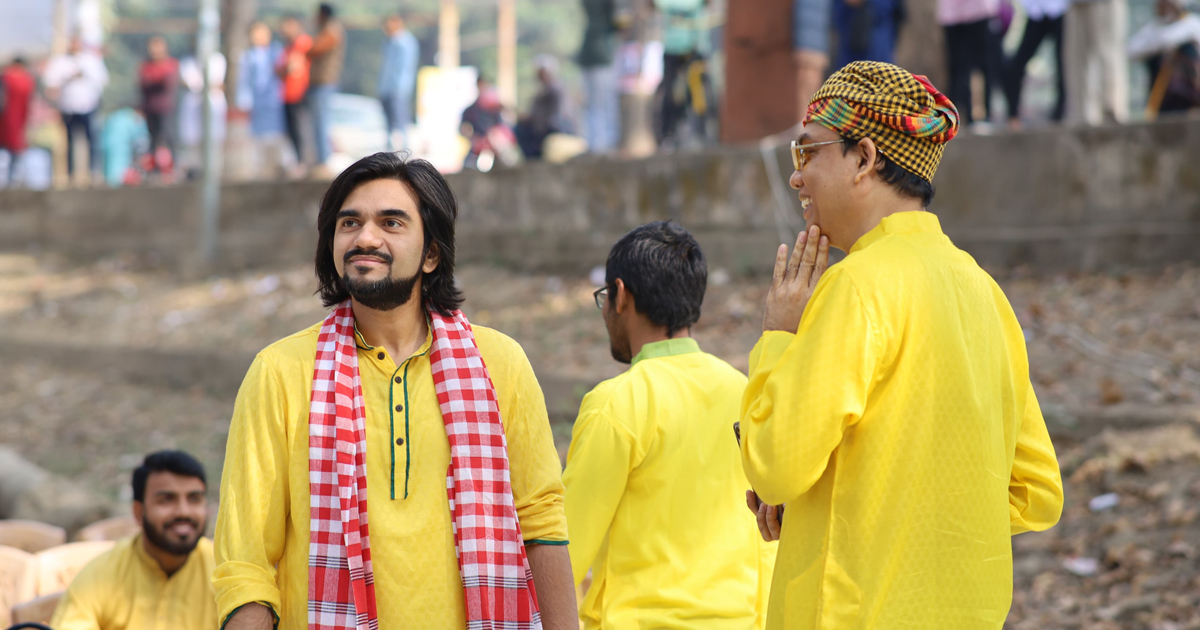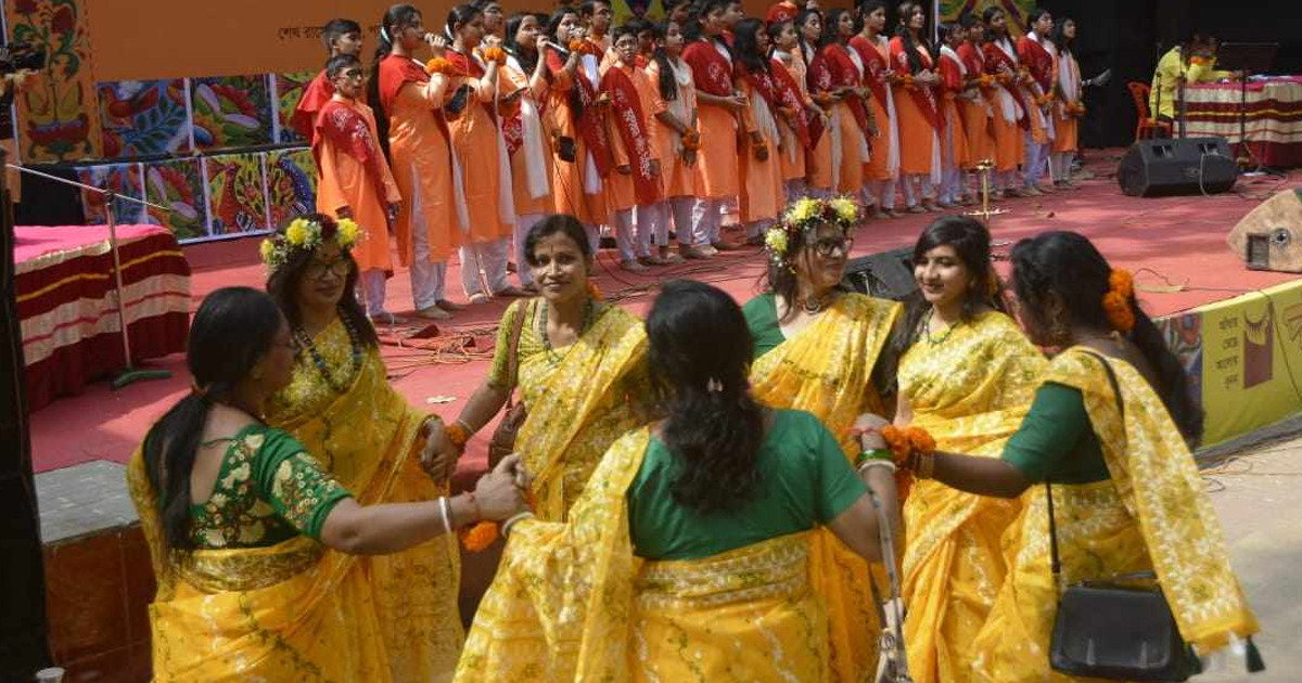 বাসন্তী রঙের শাড়ি, কপালে টিপ, হাতে চুড়ি, পায়ে নূপুর, খোঁপায় ফুল, রিং মাথায় সেজেছে তরুণীর দল। 'ফুল ফুটুক না ফুটুক আজ বসন্ত' কবি সুভাষ মুখোপাধ্যায়ের কবিতার মতো বসন্ত ছুঁয়েছে তাঁদের। তাইতো কুমার বিশ্বজিতের ‘বসন্ত ছুঁয়েছে আমাকে, ঘুমন্ত মন তাই জেগেছে’— গানে সুর মিলিয়ে মেতে উঠেছেন বসন্ত উৎসবে। কেউ গাইছেন রবীন্দ্রনাথের ‘আহা আজি এ বসন্তে, এত ফুল ফোটে, এত বাঁশি বাজে, এত পাখি গায়...। কেউবা অনুপম রায়ের আকাশে বহিছে প্রেম, নয়নে লাগিল নেশা/কারা যে ডাকিল পিছে! বসন্ত এসে গেছে/মধুর অমৃত বাণী, বেলা গেলো সহজেই/মরমে উঠিল বাজি; বসন্ত এসে গেছে/থাক তব ভুবনের ধুলিমাখা চরণে/মথা নত করে রব,বসন্ত এসে গেছে/বসন্ত এসে গেছে।