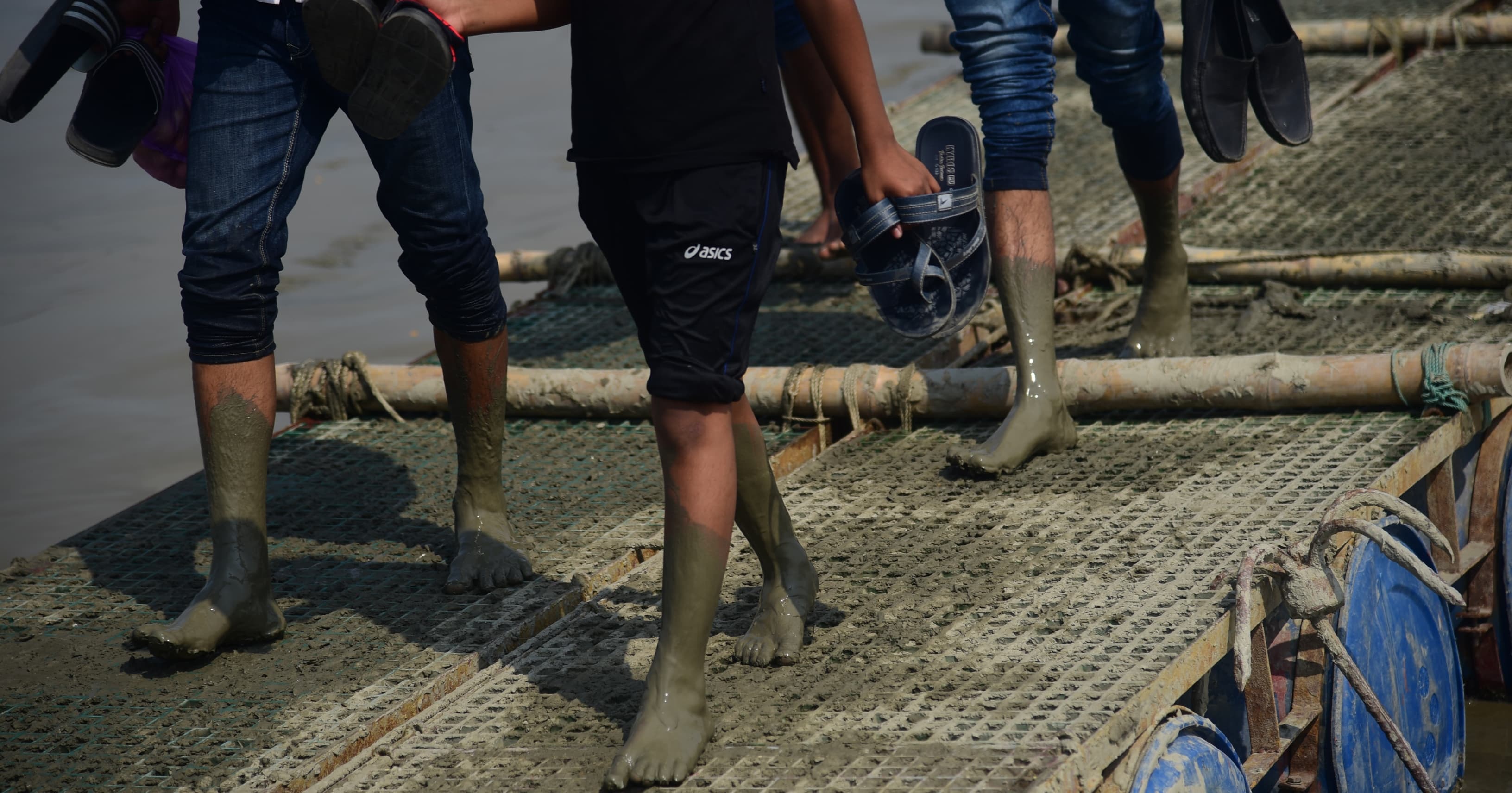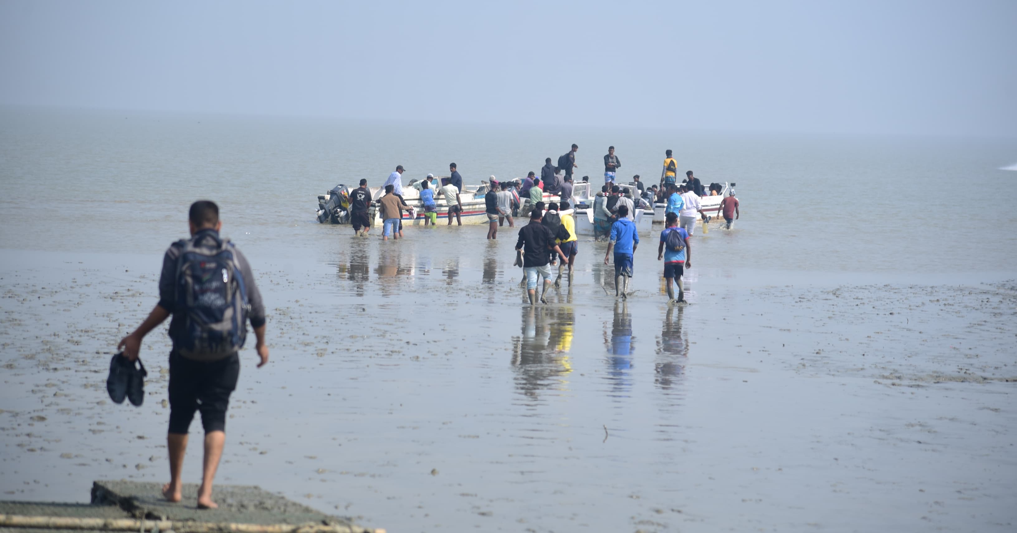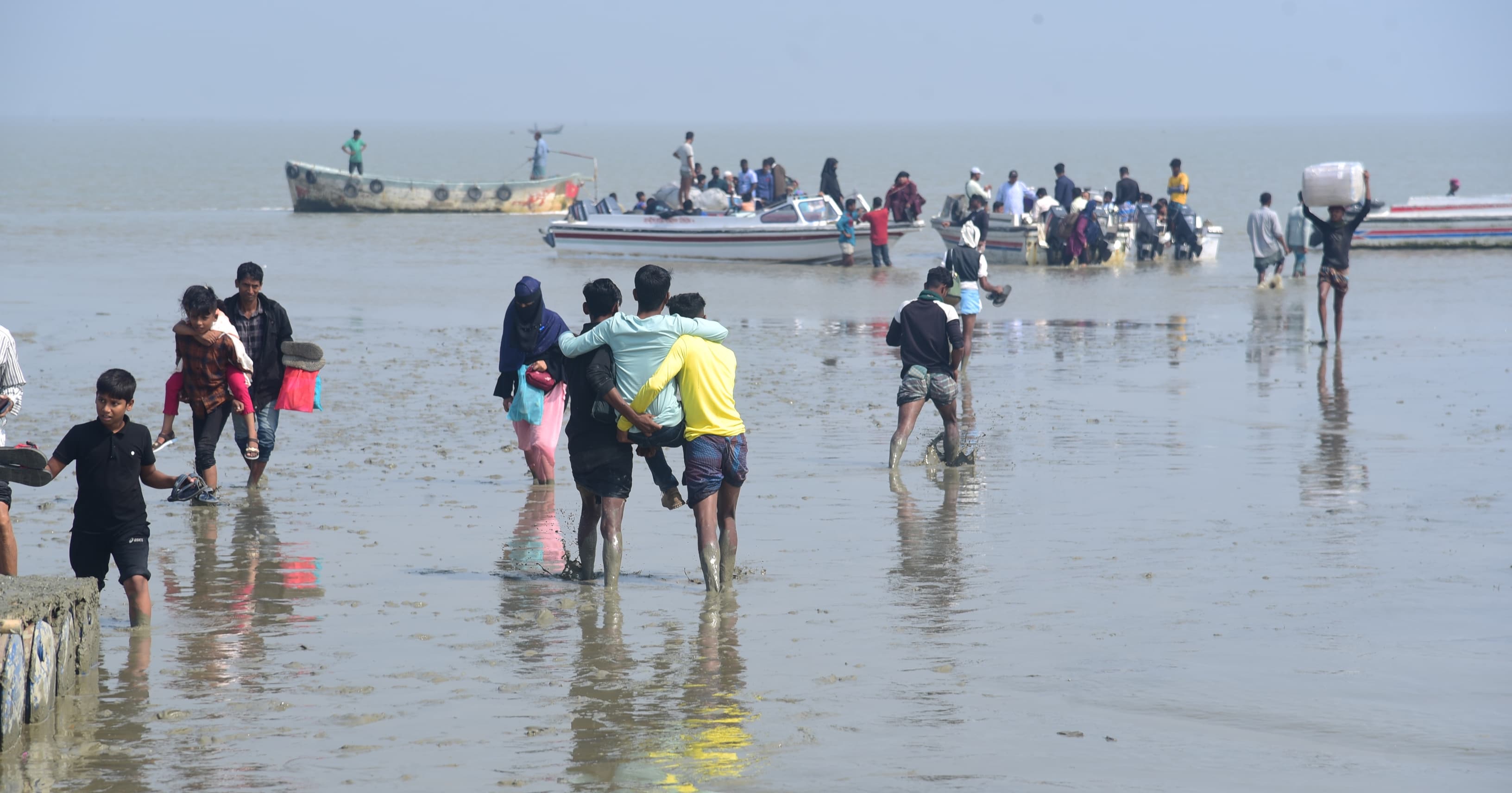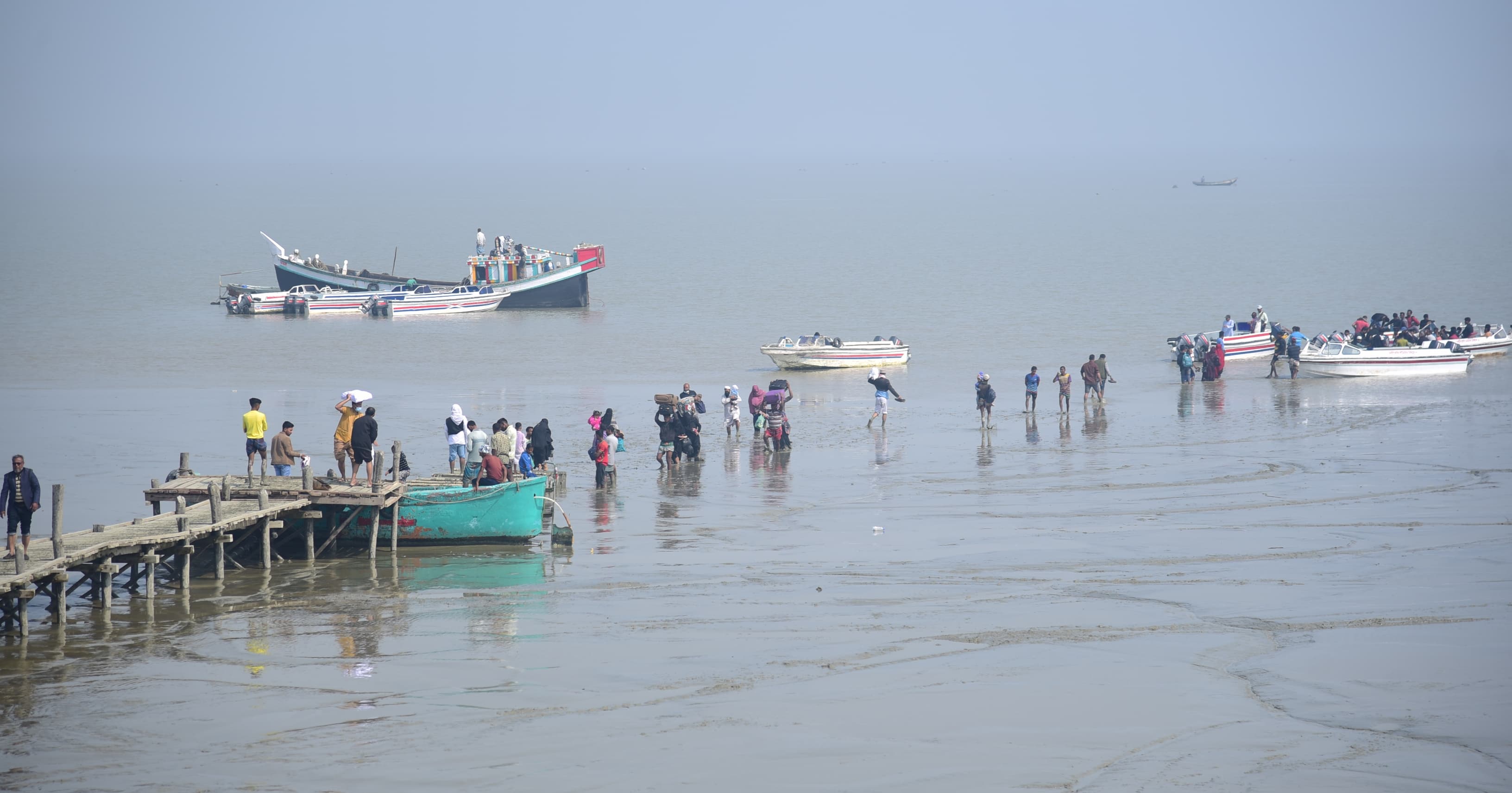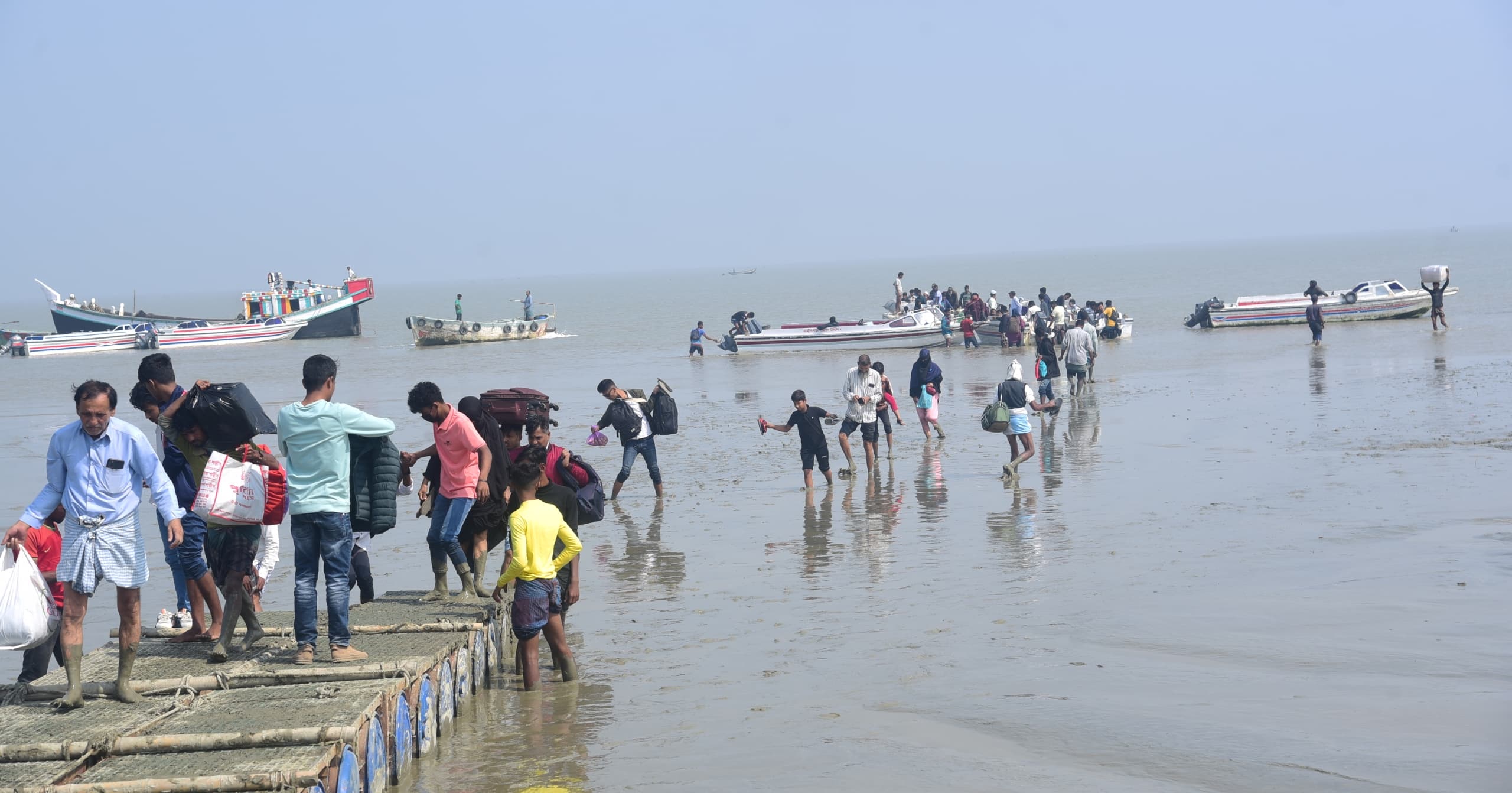হাঁটু পরিমাণ কাদা মাড়িয়ে জেটিতে যাত্রীরা